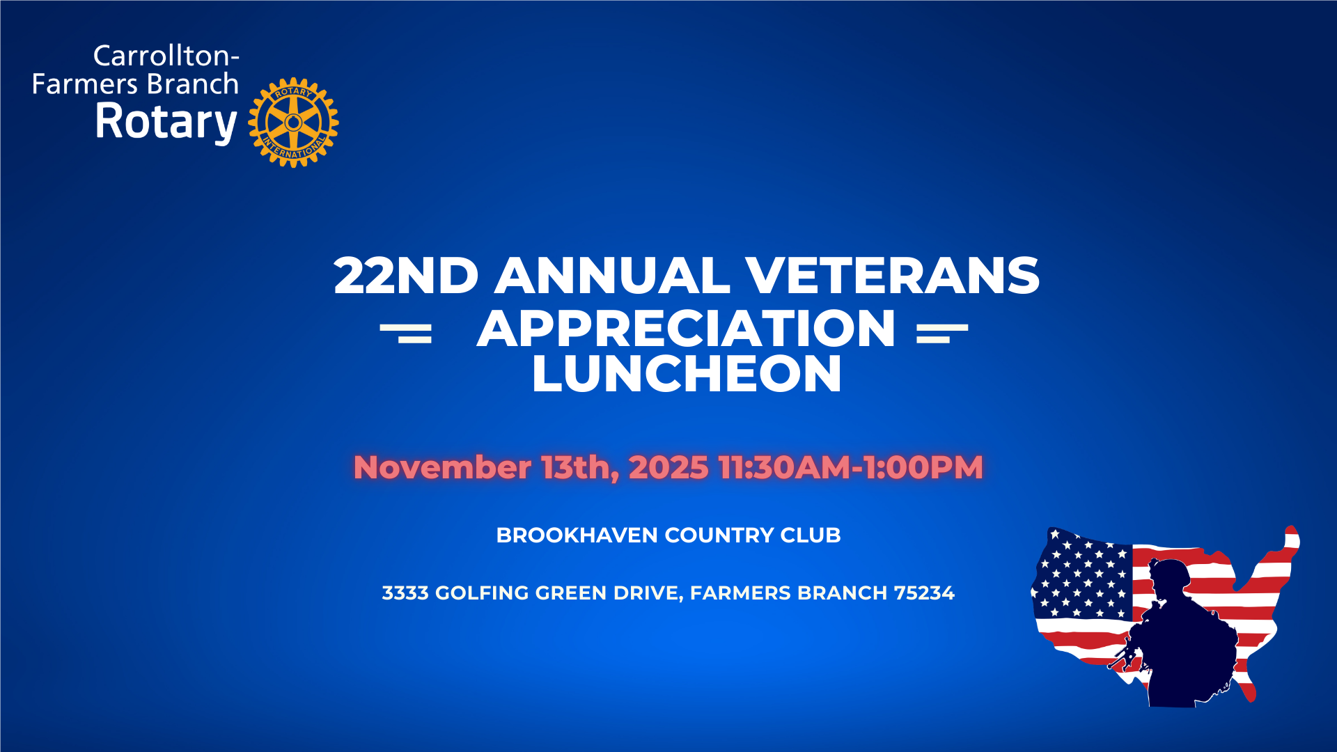 22nd Annual Veteran's Luncheon![]() Join us for the 22nd Annual Carrollton-Farmers Branch Rotary Veterans Appreciation Luncheon on November 13th, where we honor our nation’s heroes with stories of bravery, gratitude, and community. All proceeds from the event will benefit local veteran organizations, ensuring that our support for those who served continues right here at home! All Rotary Members, Guest of Rotary Members and Current or Former Military will receive complimentary access to this event. (If you are not a Rotary Member, Guest of a Rotary Member, Current or Former Military, then we kindly ask you make a $40 donation to this event that will go to local veteran organizations. Click to Register. |