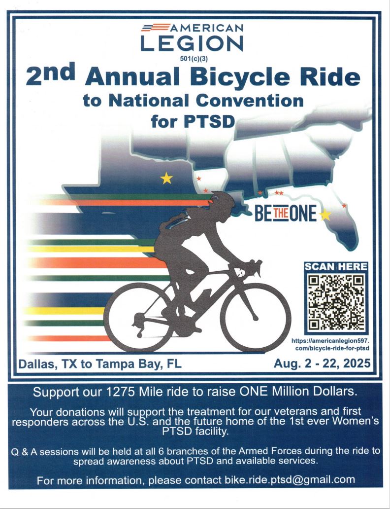 2ND Annual Bicycle Ride for PTSDOur local American Legion based in Carrollton is ridding 1275 miles from Dallas to Tampa Bay, FL in support of raising money for PTSD. They are especially wanting to raise money in support of providing a facility for women in the military suffering from PTSD.